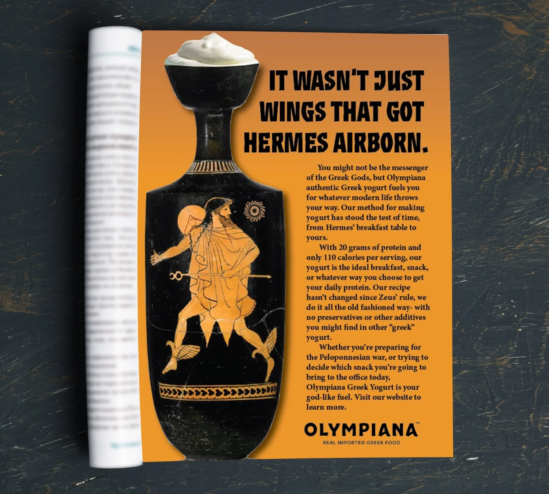 Olympiana Yogurt is the first and only authentic Greek yogurt sold in the United States. It is hand-strained and imported weekly to America. To further emphasize Olympiana's uniqueness, my team orchestrated a campaign that speaks to Greek heritage, using inspiration from Greek vases in each advertisement and renowned Greek history in each headline. After all, Olympiana Yogurt has the credentials for a campaign without that cliche Greek typeface and ‘cyan blue’.